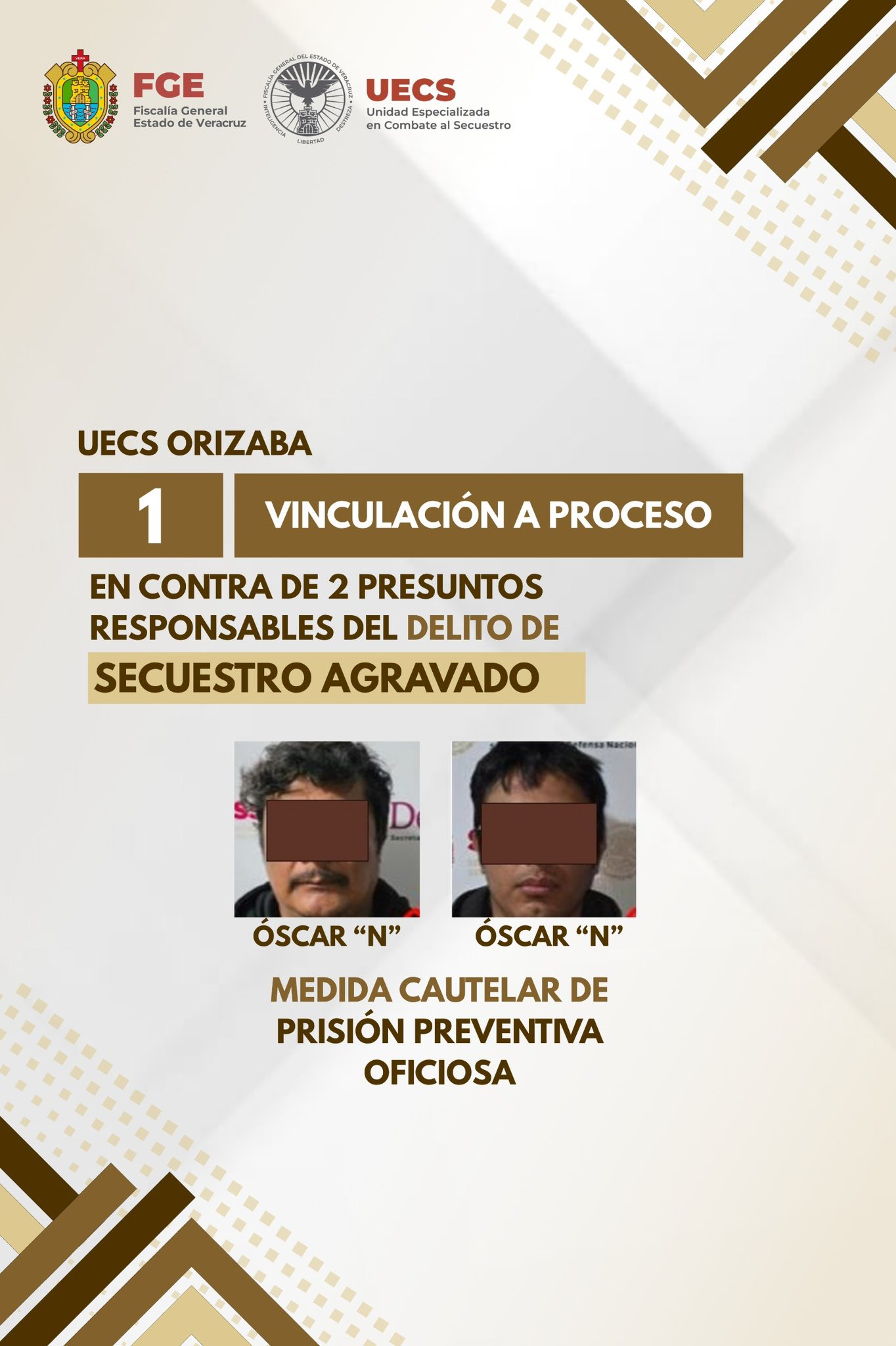 En ๐—ข๐—ฟ๐—ถ๐˜‡๐—ฎ๐—ฏ๐—ฎ, la ๐—ฎ๐˜‚๐˜๐—ผ๐—ฟ๐—ถ๐—ฑ๐—ฎ๐—ฑ ๐—ท๐˜‚๐—ฑ๐—ถ๐—ฐ๐—ถ๐—ฎ๐—น dictรณ la ๐˜ƒ๐—ถ๐—ป๐—ฐ๐˜‚๐—น๐—ฎ๐—ฐ๐—ถ๐—ผฬ๐—ป ๐—ฎ ๐—ฝ๐—ฟ๐—ผ๐—ฐ๐—ฒ๐˜€๐—ผ en contra de ๐—ขฬ๐˜€๐—ฐ๐—ฎ๐—ฟ โ€œ๐—กโ€ ๐˜† ๐—ขฬ๐˜€๐—ฐ๐—ฎ๐—ฟ โ€œ๐—กโ€, a quienes se les seรฑala como presuntos responsables del delito de ๐˜€๐—ฒ๐—ฐ๐˜‚๐—ฒ๐˜€๐˜๐—ฟ๐—ผ ๐—ฎ๐—ด๐—ฟ๐—ฎ๐˜ƒ๐—ฎ๐—ฑ๐—ผ, cometido en agravio de cuatro vรญctimas de identidades reservadas, con quienes el primero mantenรญa vรญnculos familiares.