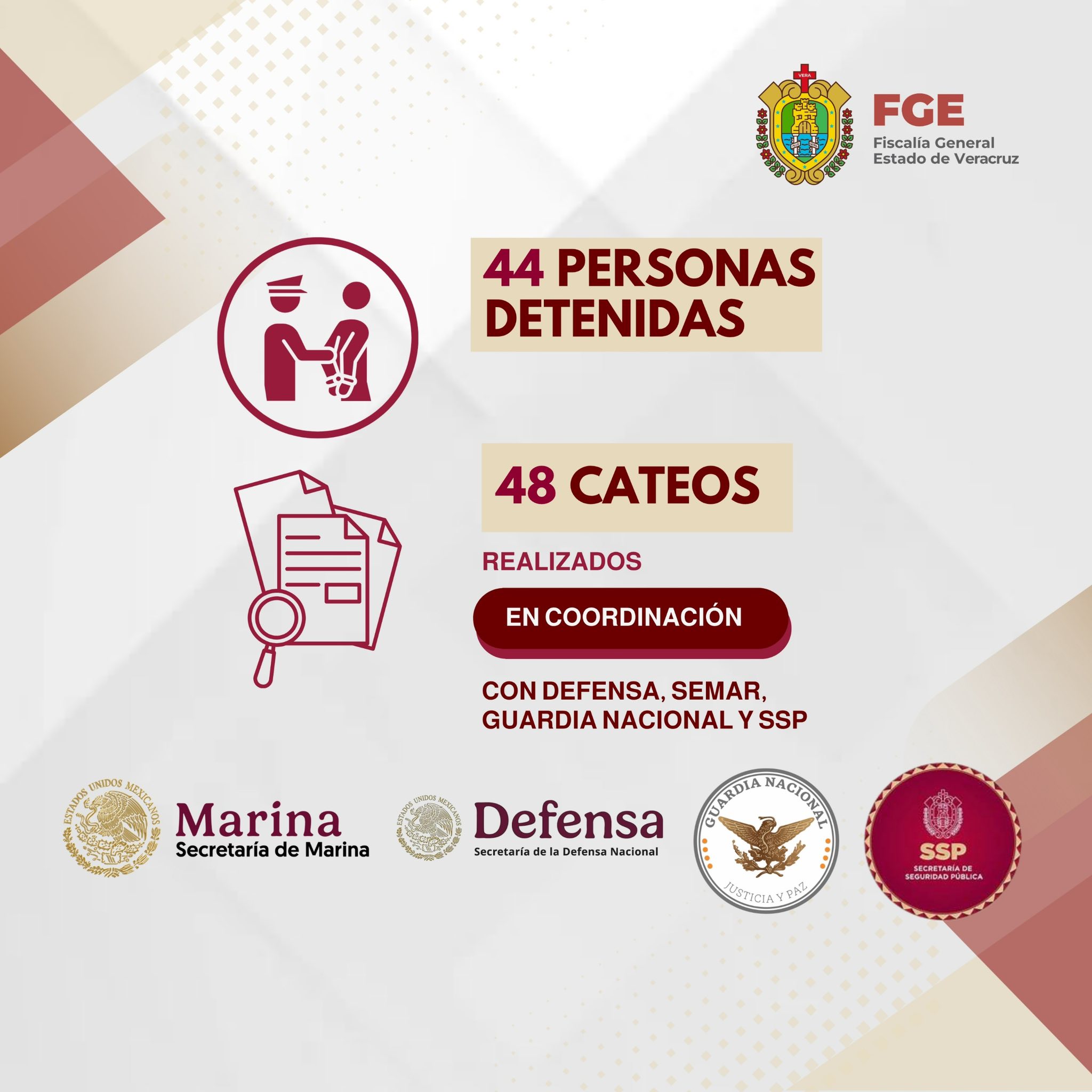 En el marco de una ๐—ฒ๐˜€๐˜๐—ฟ๐—ฎ๐˜๐—ฒ๐—ด๐—ถ๐—ฎ ๐—ผ๐—ฝ๐—ฒ๐—ฟ๐—ฎ๐˜๐—ถ๐˜ƒ๐—ฎ orientada a ๐—ณ๐—ผ๐—ฟ๐˜๐—ฎ๐—น๐—ฒ๐—ฐ๐—ฒ๐—ฟ ๐—น๐—ฎ ๐—ฝ๐—ฎ๐˜‡ ๐˜€๐—ผ๐—ฐ๐—ถ๐—ฎ๐—น, durante el periodo del ๐Ÿญ๐Ÿฒ ๐—ฎ๐—น ๐Ÿฎ๐Ÿฎ ๐—ฑ๐—ฒ ๐—บ๐—ฎ๐—ฟ๐˜‡๐—ผ, la ๐—™๐—ถ๐˜€๐—ฐ๐—ฎ๐—น๐—ถฬ๐—ฎ ๐—š๐—ฒ๐—ป๐—ฒ๐—ฟ๐—ฎ๐—น ๐—ฑ๐—ฒ๐—น ๐—˜๐˜€๐˜๐—ฎ๐—ฑ๐—ผ ๐—ฑ๐—ฒ ๐—ฉ๐—ฒ๐—ฟ๐—ฎ๐—ฐ๐—ฟ๐˜‚๐˜‡, a travรฉs de sus ๐—ณ๐—ถ๐˜€๐—ฐ๐—ฎ๐—น๐—ถฬ๐—ฎ๐˜€ ๐—ฟ๐—ฒ๐—ด๐—ถ๐—ผ๐—ป๐—ฎ๐—น๐—ฒ๐˜€, logrรณ la ๐—ฑ๐—ฒ๐˜๐—ฒ๐—ป๐—ฐ๐—ถ๐—ผฬ๐—ป ๐—ฒ๐—ป ๐—ณ๐—น๐—ฎ๐—ด๐—ฟ๐—ฎ๐—ป๐—ฐ๐—ถ๐—ฎ de ๐Ÿฐ๐Ÿฐ ๐—ฝ๐—ฒ๐—ฟ๐˜€๐—ผ๐—ป๐—ฎ๐˜€ presuntamente vinculadas a actividades ilรญcitas, durante la ejecuciรณn de ๐Ÿฐ๐Ÿด ๐—ฐ๐—ฎ๐˜๐—ฒ๐—ผ๐˜€ ๐—ฎ๐˜‚๐˜๐—ผ๐—ฟ๐—ถ๐˜‡๐—ฎ๐—ฑ๐—ผ๐˜€ por la autoridad judicial en ๐Ÿฏ๐Ÿฏ ๐—บ๐˜‚๐—ป๐—ถ๐—ฐ๐—ถ๐—ฝ๐—ถ๐—ผ๐˜€.