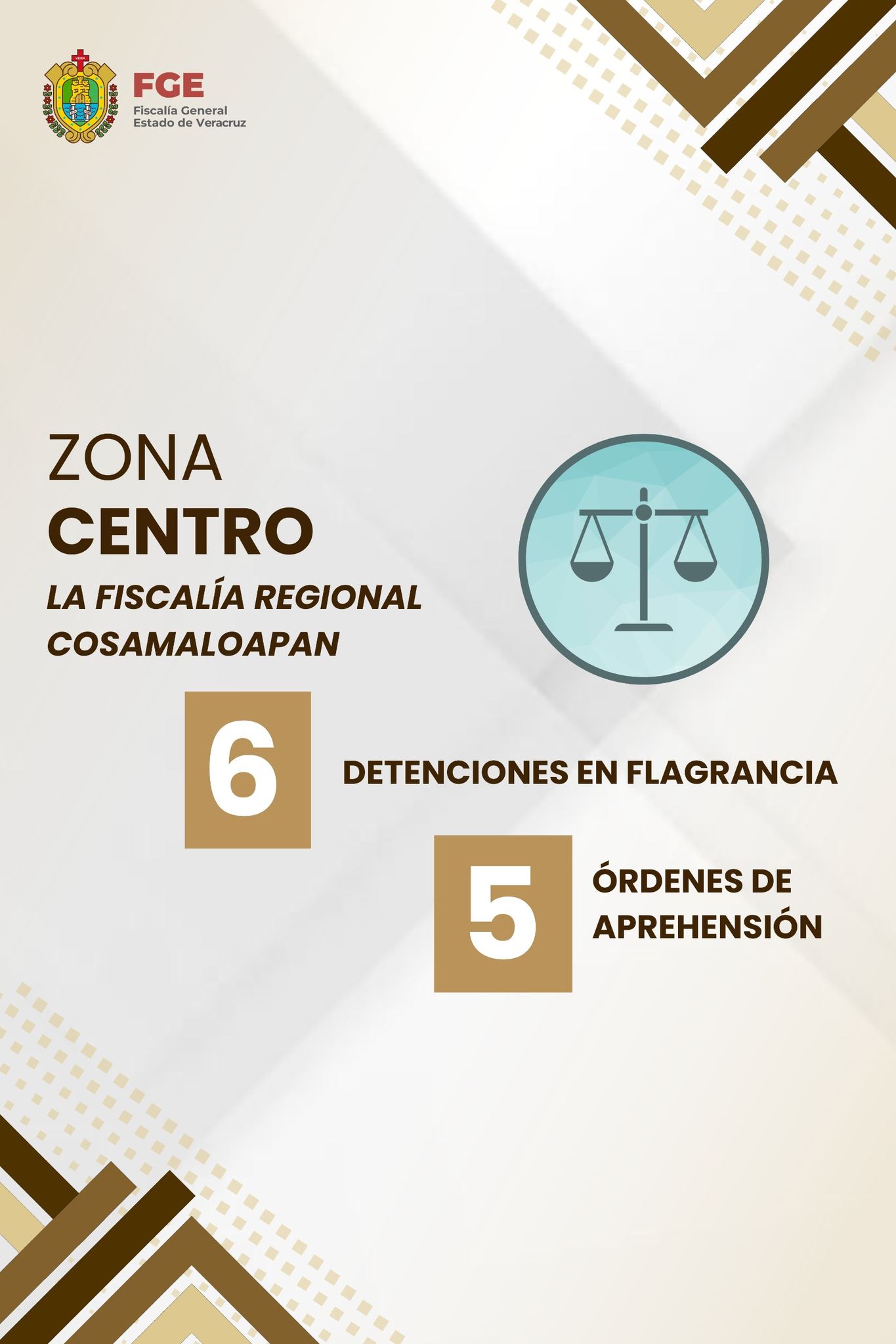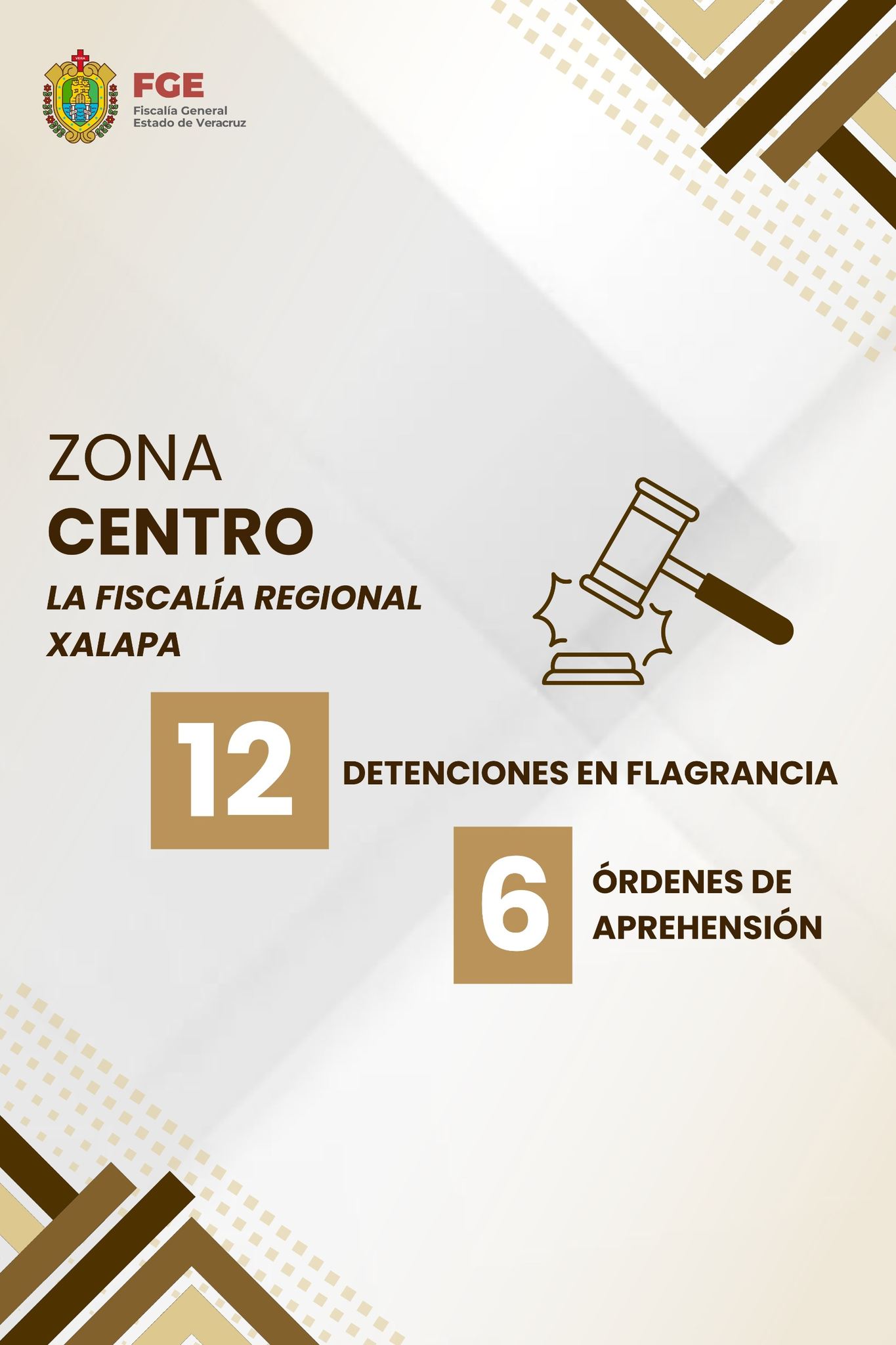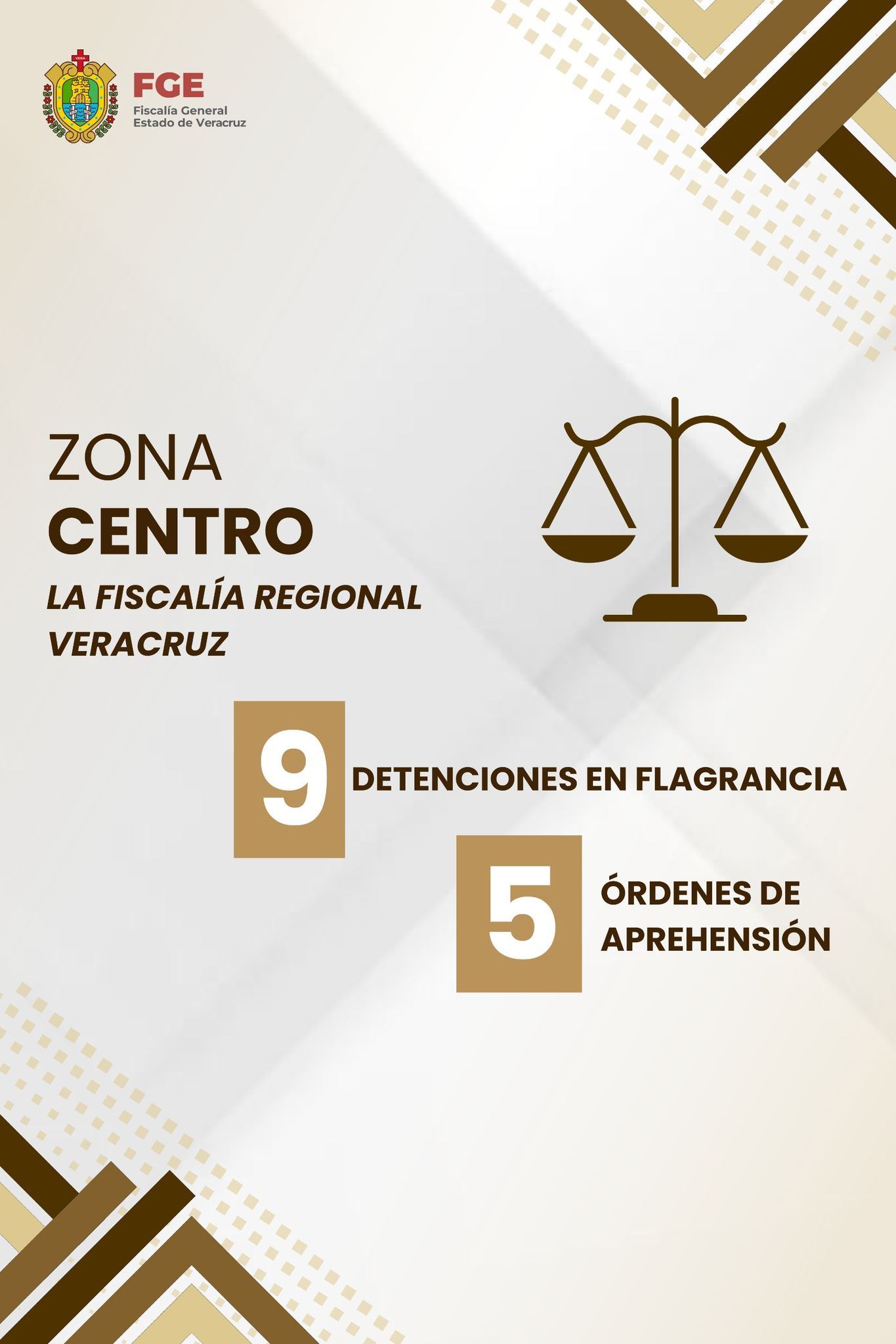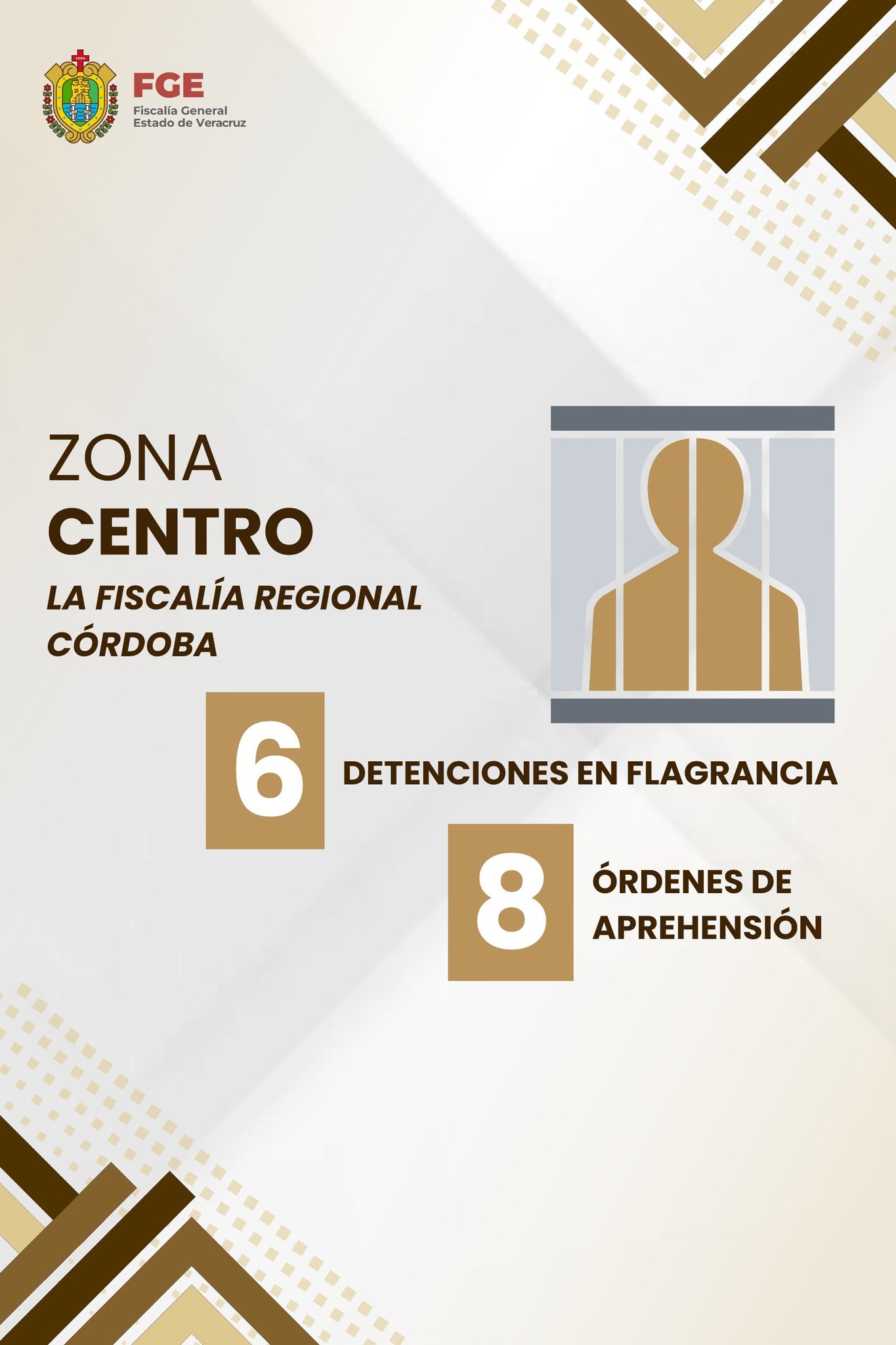 Asimismo, en la 𝘇𝗼𝗻𝗮 𝗰𝗲𝗻𝘁𝗿𝗼, la 𝗙𝗶𝘀𝗰𝗮𝗹𝗶́𝗮 𝗥𝗲𝗴𝗶𝗼𝗻𝗮𝗹 𝗩𝗲𝗿𝗮𝗰𝗿𝘂𝘇 concretó 𝟵 𝗱𝗲𝘁𝗲𝗻𝗰𝗶𝗼𝗻𝗲𝘀 en flagrancia y cumplimentó 𝟱 𝗼́𝗿𝗱𝗲𝗻𝗲𝘀 de aprehensión; en tanto que la 𝗙𝗶𝘀𝗰𝗮𝗹𝗶́𝗮 𝗥𝗲𝗴𝗶𝗼𝗻𝗮𝗹 𝗖𝗼́𝗿𝗱𝗼𝗯𝗮 registró 𝟲 𝗱𝗲𝘁𝗲𝗻𝗰𝗶𝗼𝗻𝗲𝘀 en flagrancia y ejecutó 𝟴 𝗼́𝗿𝗱𝗲𝗻𝗲𝘀.