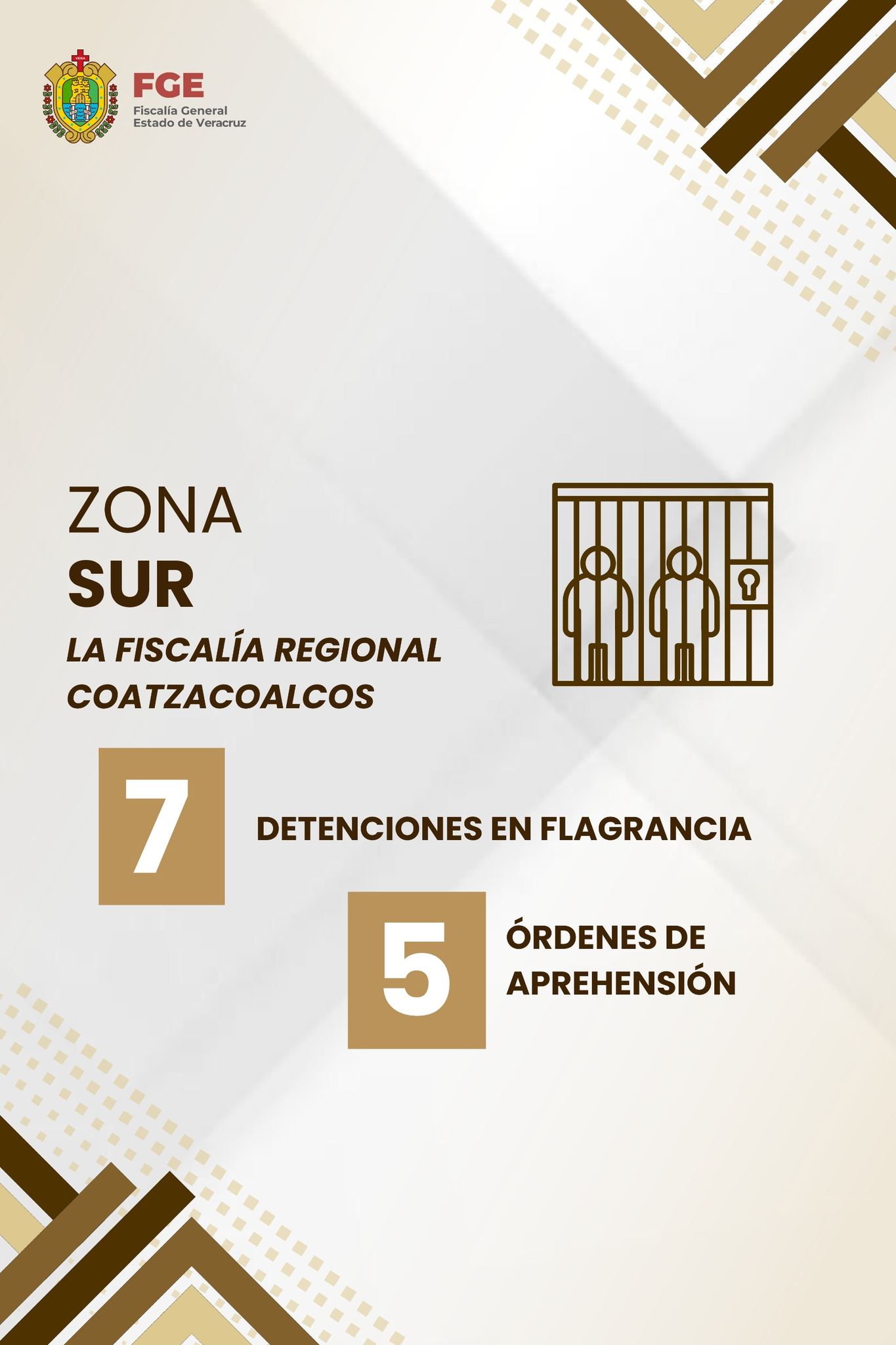 En lo que respecta a la 𝘇𝗼𝗻𝗮 𝘀𝘂𝗿, la 𝗙𝗶𝘀𝗰𝗮𝗹𝗶́𝗮 𝗥𝗲𝗴𝗶𝗼𝗻𝗮𝗹 𝗖𝗼𝗮𝘁𝘇𝗮𝗰𝗼𝗮𝗹𝗰𝗼𝘀 cumplimentó 5 órdenes de aprehensión y realizó 𝟳 𝗱𝗲𝘁𝗲𝗻𝗰𝗶𝗼𝗻𝗲𝘀 en flagrancia.