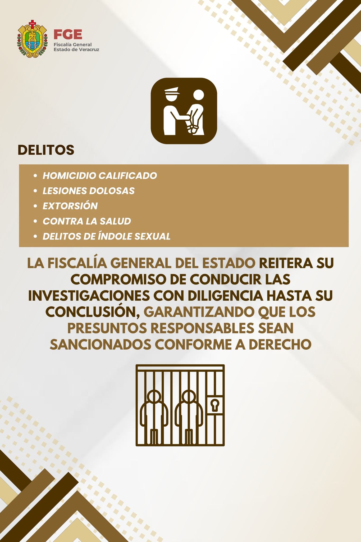 Asimismo, se contemplan 𝗱𝗲𝗹𝗶𝘁𝗼𝘀 𝗱𝗲 𝗶́𝗻𝗱𝗼𝗹𝗲 𝘀𝗲𝘅𝘂𝗮𝗹, 𝗲𝘅𝘁𝗼𝗿𝘀𝗶𝗼́𝗻 𝘆 𝗰𝗼𝗻𝘁𝗿𝗮 𝗹𝗮 𝘀𝗮𝗹𝘂𝗱, además de otros ilícitos atendidos durante este periodo.
