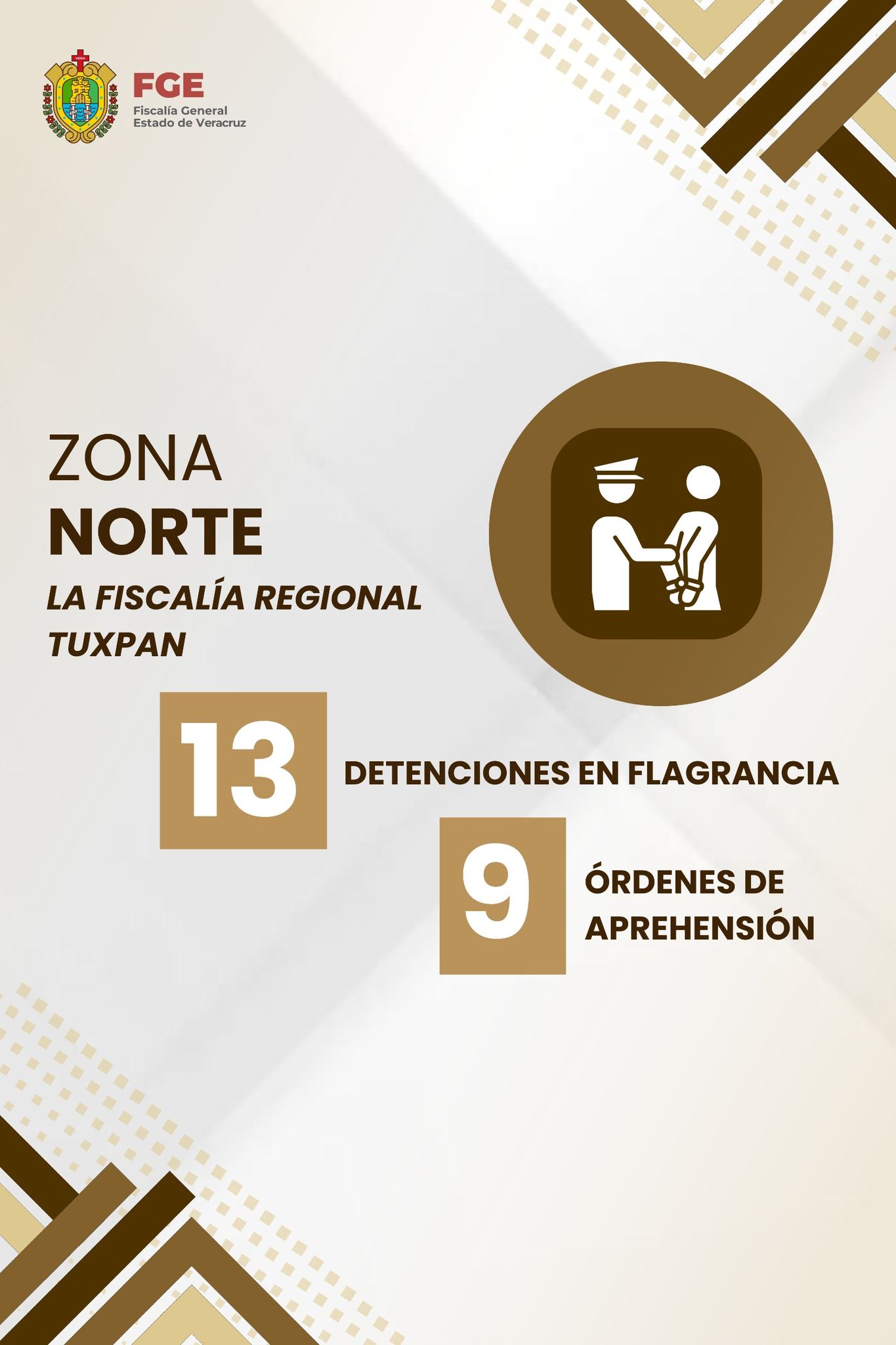 Dentro de la 𝘇𝗼𝗻𝗮 𝗻𝗼𝗿𝘁𝗲, se reportó 𝟭 𝗱𝗲𝘁𝗲𝗻𝗰𝗶𝗼́𝗻 en flagrancia y el cumplimiento de 𝟳 𝗼́𝗿𝗱𝗲𝗻𝗲𝘀 𝗱𝗲 𝗮𝗽𝗿𝗲𝗵𝗲𝗻𝘀𝗶𝗼́𝗻 por parte de la 𝗙𝗶𝘀𝗰𝗮𝗹𝗶́𝗮 𝗥𝗲𝗴𝗶𝗼𝗻𝗮𝗹 𝗧𝗮𝗻𝘁𝗼𝘆𝘂𝗰𝗮, mientras que la 𝗙𝗶𝘀𝗰𝗮𝗹𝗶́𝗮 𝗥𝗲𝗴𝗶𝗼𝗻𝗮𝗹 𝗧𝘂𝘅𝗽𝗮𝗻 llevó a cabo 𝟭𝟯 𝗱𝗲𝘁𝗲𝗻𝗰𝗶𝗼𝗻𝗲𝘀 en flagrancia y ejecutó 𝟵 𝗼́𝗿𝗱𝗲𝗻𝗲𝘀 de aprehensión.