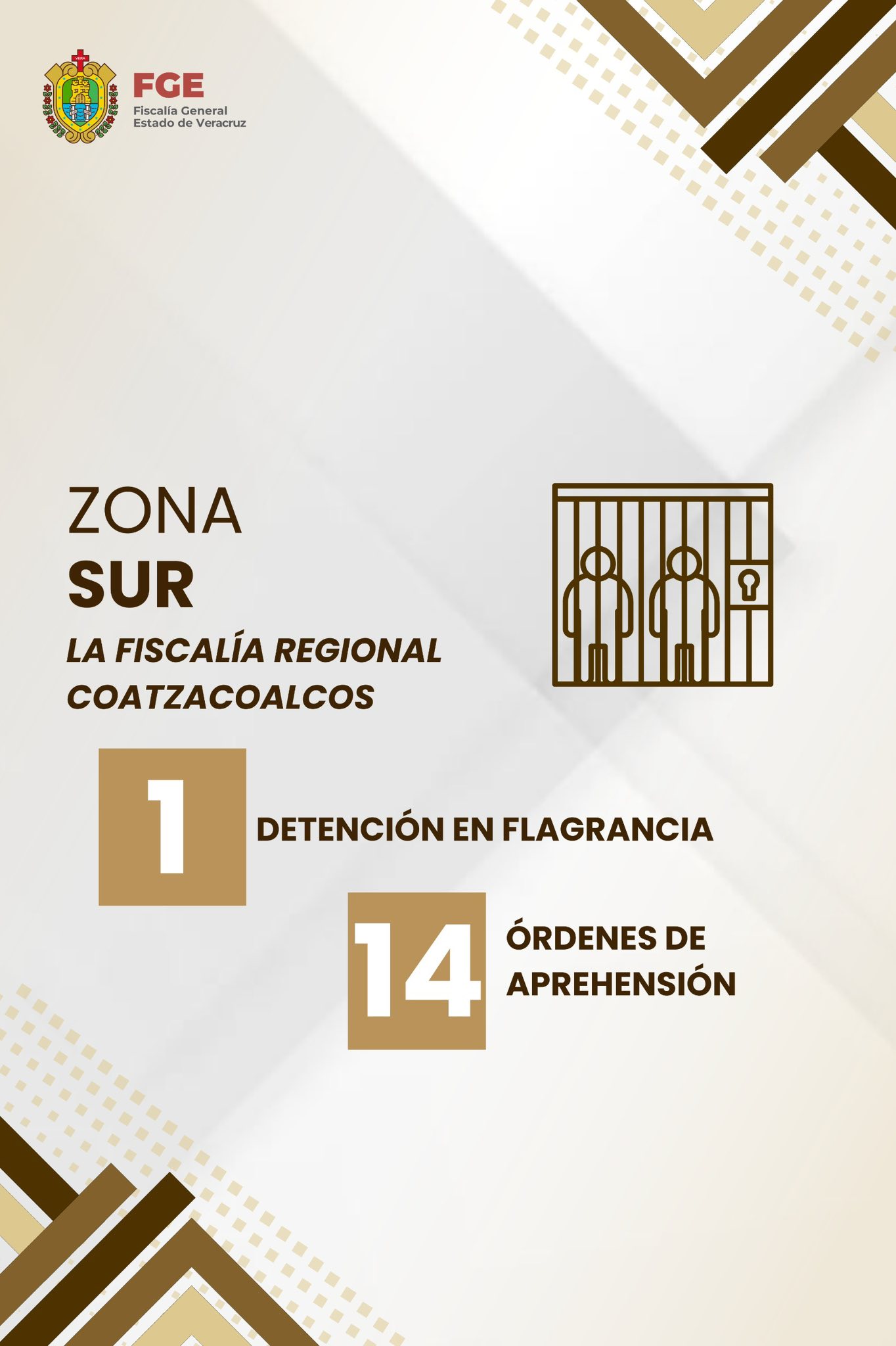 En lo que respecta a la 𝘇𝗼𝗻𝗮 𝘀𝘂𝗿, la 𝗙𝗶𝘀𝗰𝗮𝗹𝗶́𝗮 𝗥𝗲𝗴𝗶𝗼𝗻𝗮𝗹 𝗖𝗼𝗮𝘁𝘇𝗮𝗰𝗼𝗮𝗹𝗰𝗼𝘀 cumplimentó 𝟭𝟰 𝗼́𝗿𝗱𝗲𝗻𝗲𝘀 𝗱𝗲 𝗮𝗽𝗿𝗲𝗵𝗲𝗻𝘀𝗶𝗼́𝗻 y realizó 𝟭 𝗱𝗲𝘁𝗲𝗻𝗰𝗶𝗼́𝗻 𝗲𝗻 𝗳𝗹𝗮𝗴𝗿𝗮𝗻𝗰𝗶𝗮.