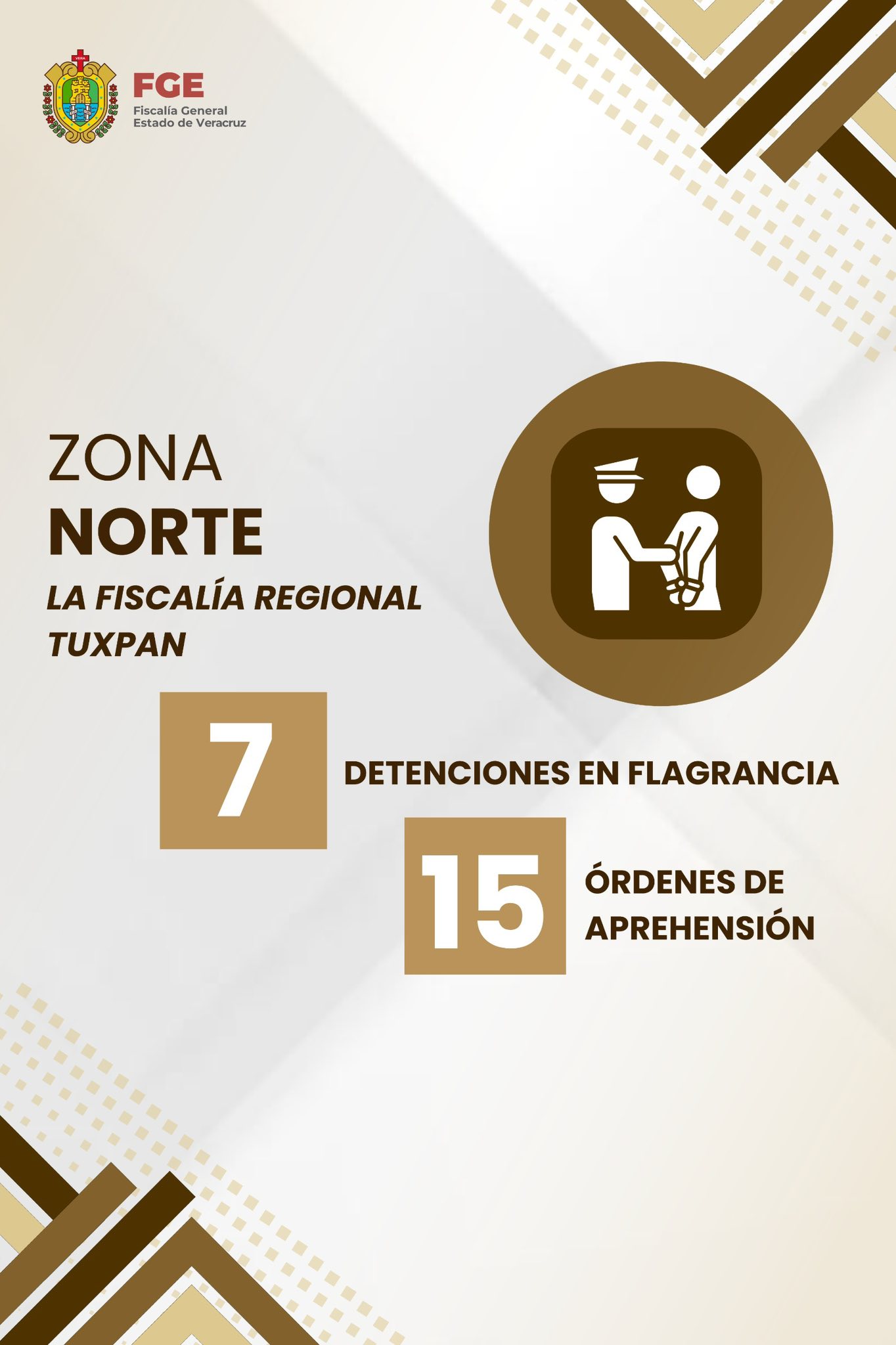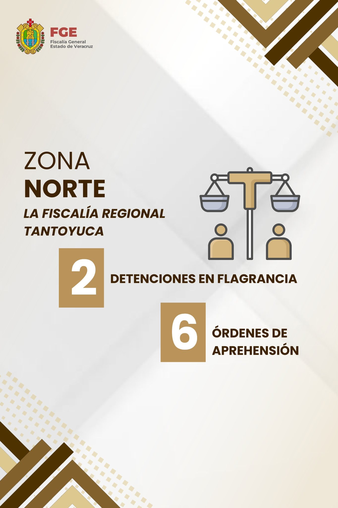 Dentro de la 𝘇𝗼𝗻𝗮 𝗻𝗼𝗿𝘁𝗲, se reportaron 𝟮 𝗱𝗲𝘁𝗲𝗻𝗰𝗶𝗼𝗻𝗲𝘀 𝗲𝗻 𝗳𝗹𝗮𝗴𝗿𝗮𝗻𝗰𝗶𝗮 y el cumplimiento de 𝟲 𝗼́𝗿𝗱𝗲𝗻𝗲𝘀 𝗱𝗲 𝗮𝗽𝗿𝗲𝗵𝗲𝗻𝘀𝗶𝗼́𝗻 por parte de la 𝗙𝗶𝘀𝗰𝗮𝗹𝗶́𝗮 𝗥𝗲𝗴𝗶𝗼𝗻𝗮𝗹 𝗧𝗮𝗻𝘁𝗼𝘆𝘂𝗰𝗮; mientras que la 𝗙𝗶𝘀𝗰𝗮𝗹𝗶́𝗮 𝗥𝗲𝗴𝗶𝗼𝗻𝗮𝗹 𝗧𝘂𝘅𝗽𝗮𝗻 llevó a cabo 𝟳 𝗱𝗲𝘁𝗲𝗻𝗰𝗶𝗼𝗻𝗲𝘀 𝗲𝗻 𝗳𝗹𝗮𝗴𝗿𝗮𝗻𝗰𝗶𝗮 y ejecutó 𝟭𝟱 𝗼́𝗿𝗱𝗲𝗻𝗲𝘀 𝗱𝗲 𝗮𝗽𝗿𝗲𝗵𝗲𝗻𝘀𝗶𝗼́𝗻.
