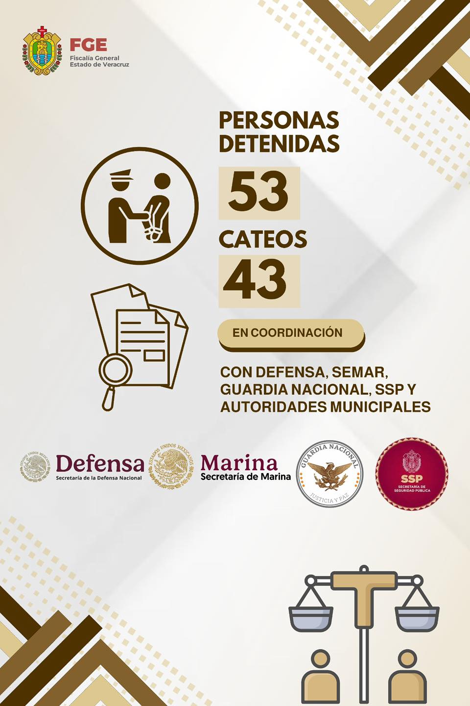 En el marco de una estrategia operativa ๐ผ๐ฟ๐ถ๐ฒ๐ป๐๐ฎ๐ฑ๐ฎ ๐ฎ ๐ณ๐ผ๐ฟ๐๐ฎ๐น๐ฒ๐ฐ๐ฒ๐ฟ ๐น๐ฎ ๐ฝ๐ฎ๐ ๐๐ผ๐ฐ๐ถ๐ฎ๐น, durante el periodo del ๐ฒ ๐ฎ๐น ๐ญ๐ฎ ๐ฑ๐ฒ ๐ฎ๐ฏ๐ฟ๐ถ๐น, la ๐๐ถ๐๐ฐ๐ฎ๐น๐ถฬ๐ฎ ๐๐ฒ๐ป๐ฒ๐ฟ๐ฎ๐น ๐ฑ๐ฒ๐น ๐๐๐๐ฎ๐ฑ๐ผ ๐ฑ๐ฒ ๐ฉ๐ฒ๐ฟ๐ฎ๐ฐ๐ฟ๐๐, a travรฉs de sus ๐ณ๐ถ๐๐ฐ๐ฎ๐น๐ถฬ๐ฎ๐ ๐ฟ๐ฒ๐ด๐ถ๐ผ๐ป๐ฎ๐น๐ฒ๐ ๐ฒ ๐ถ๐๐ถ๐ป๐ฒ๐ฟ๐ฎ๐ป๐๐ฒ๐, logrรณ la detenciรณn en flagrancia de ๐ฑ๐ฏ ๐ฝ๐ฒ๐ฟ๐๐ผ๐ป๐ฎ๐ presuntamente vinculadas a actividades ilรญcitas, durante la ejecuciรณn de 43 cateos autorizados por la autoridad judicial en ๐ฏ๐ฌ ๐บ๐๐ป๐ถ๐ฐ๐ถ๐ฝ๐ถ๐ผ๐.