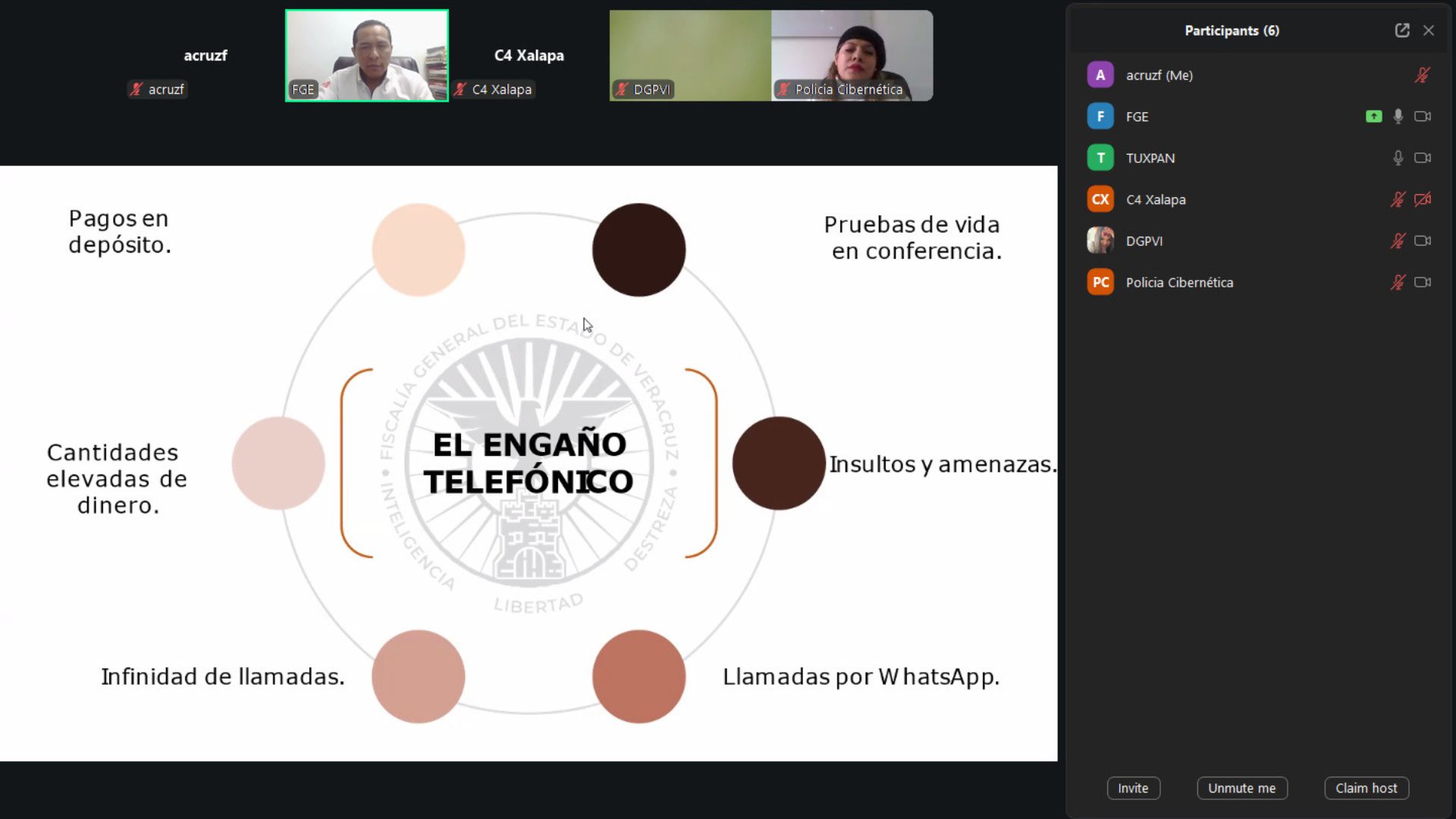 Asimismo, se capacitó al personal administrativo del Centro de Reinserción Social de Tuxpan mediante una plática virtual, en la que se difundieron las principales medidas de prevención y las características que permiten identificar el engaño telefónico, con la finalidad de detectarlo e inhibirlo, evitando así que más personas sean víctimas de este delito.