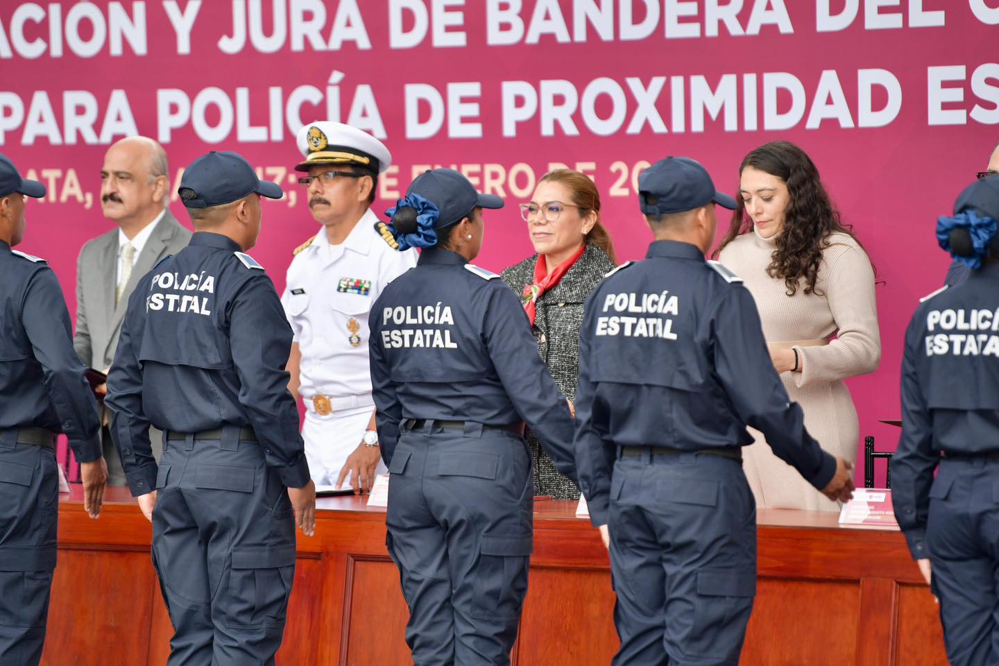 La Fiscal General del Estado, Lisbeth Aurelia Jiménez Aguirre, asistió a la Ceremonia de Graduación y Jura de Bandera del Curso de Formación Inicial para Policía de Proximidad Aspirante Estatal, realizada este jueves en el Centro de Estudios e Investigación en Seguridad (CEIS), donde se reconoció la graduación de 53 nuevos elementos.