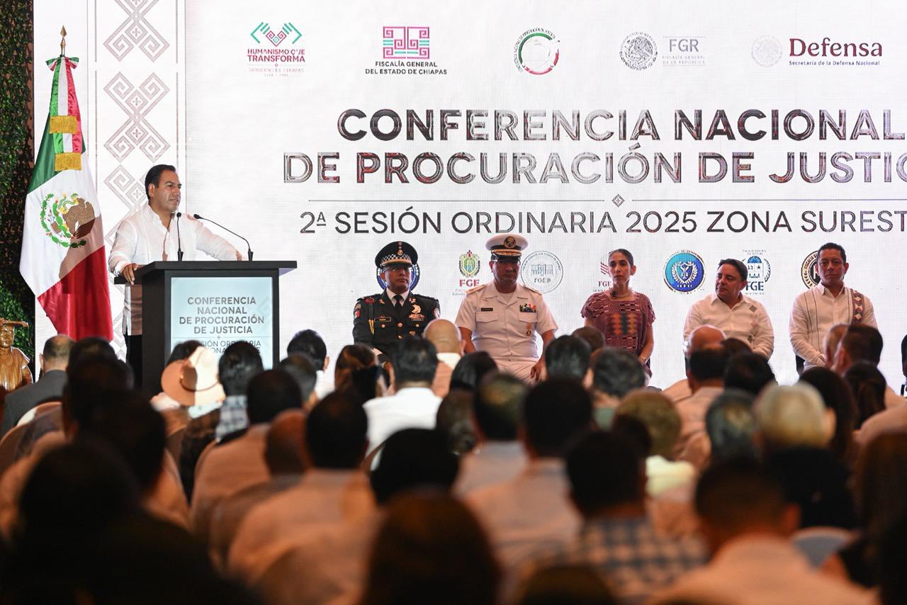 Tuxtla Gutiérrez, Chiapas, 24 de octubre de 2025.-La Fiscal General del Estado, Verónica Hernández Giadáns, en su calidad de representante de la Zona Sureste, participó en la Segunda Sesión Ordinaria 2025 de la Conferencia Nacional de Procuración de Justicia (CNPJ) de esta zona. El acto inaugural contó con la presencia del Gobernador del Estado de Chiapas, Eduardo Ramírez Aguilar.Este encuentro fue encabezado por el Fiscal Especializado de Control Regional, Germán Adolfo Castillo Banuet, en representación del Fiscal General de la República y Presidente de la Conferencia Nacional de Procuración de Justicia, conformada por las Fiscalías Generales de los Estados de Chiapas, Campeche, Guerrero, Oaxaca, Quintana Roo, Tabasco, Yucatán y Veracruz.Durante la sesión se abordaron temas para el fortalecimiento del sistema de justicia en el país, entre ellos la presentación de la Iniciativa de Ley General para Prevenir, Investigar y Sancionar los Delitos en Materia de Extorsión, la nueva operación de los Tribunales de Amparo, así como las reformas legales recientes en materia de seguridad. Asimismo, se analizaron los avances y la consolidación del Sistema Informático Nacional Interoperable como herramienta para la implementación de los registros mandatados por la Conferencia, y se dio seguimiento a los acuerdos de la LI Sesión Ordinaria del Consejo Nacional de Seguridad Pública, además de revisar los progresos del Sistema Estadístico Nacional de Procuración de Justicia.La Fiscal General destaca que la institución mantiene firme su compromiso con los acuerdos emanados de este espacio nacional, donde Veracruz se distingue por su cumplimiento y por el fortalecimiento permanente de los mecanismos de colaboración e intercambio de estrategias exitosas entre fiscalías, en favor de una procuración de justicia más sólida que ofrezca respuestas eficaces a la sociedad.