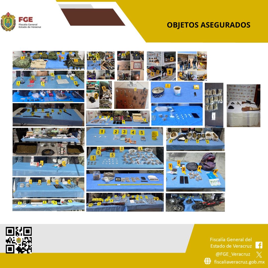 Se aseguraron casquillos, cartuchos y cargadores balísticos, teléfonos celulares, polvo granulado color blanco y piedras con características similares a las del cristal, motocicletas, juegos de llaves de vehículos, vehículos, hierba verde seca con características similares a las de la marihuana y cigarros del mismo material, accesorios para elaborar prendas de vestir, pipas de diversos materiales y hechizas, goteros de cristal, jeringas, una laptop, bolsas de plástico tipo ziploc, básculas grameras, identificaciones y documentos diversos, diábolos, papel de arroz para liar, una fornitura, un proyectil, máscaras de plástico, encendedores y una libreta con anotaciones.