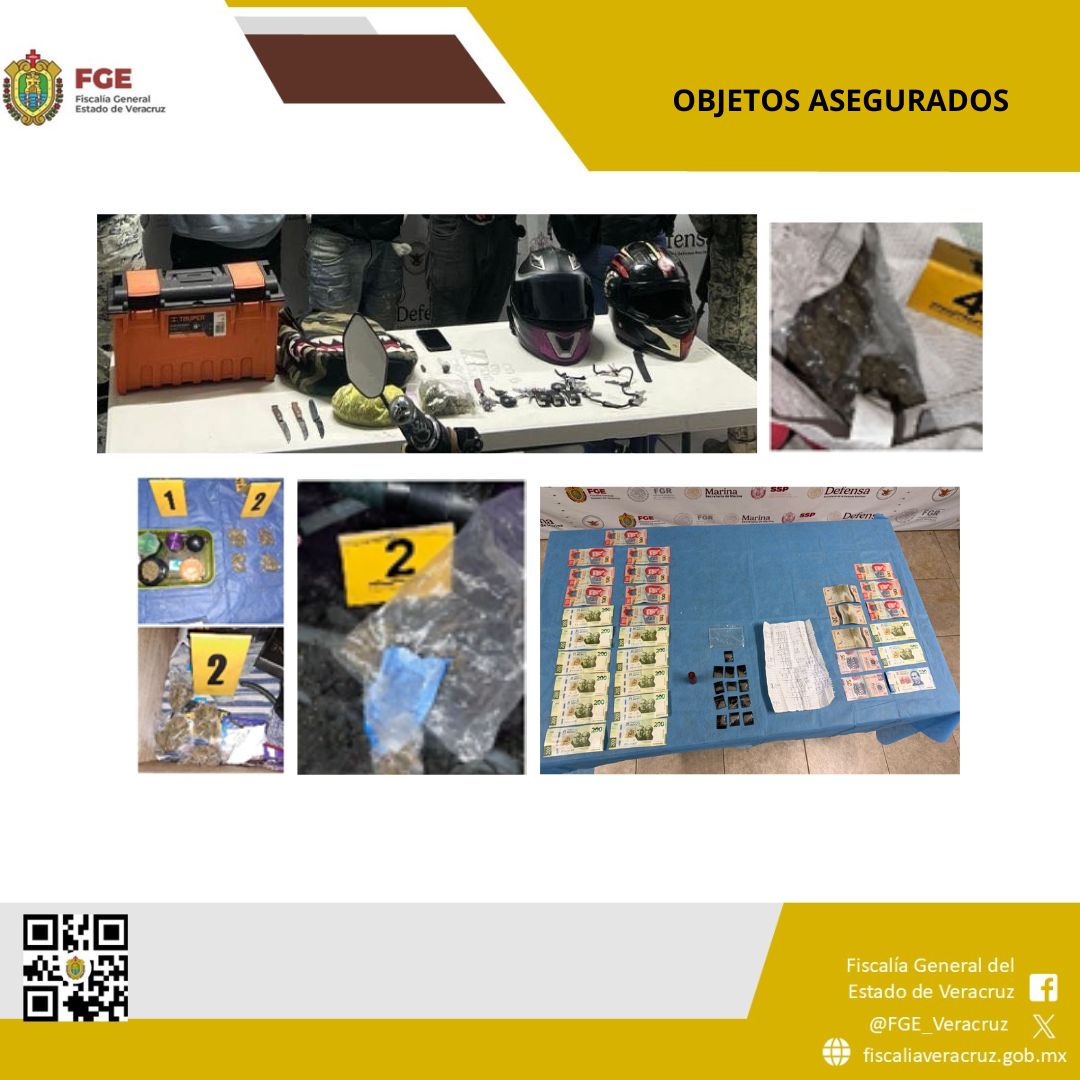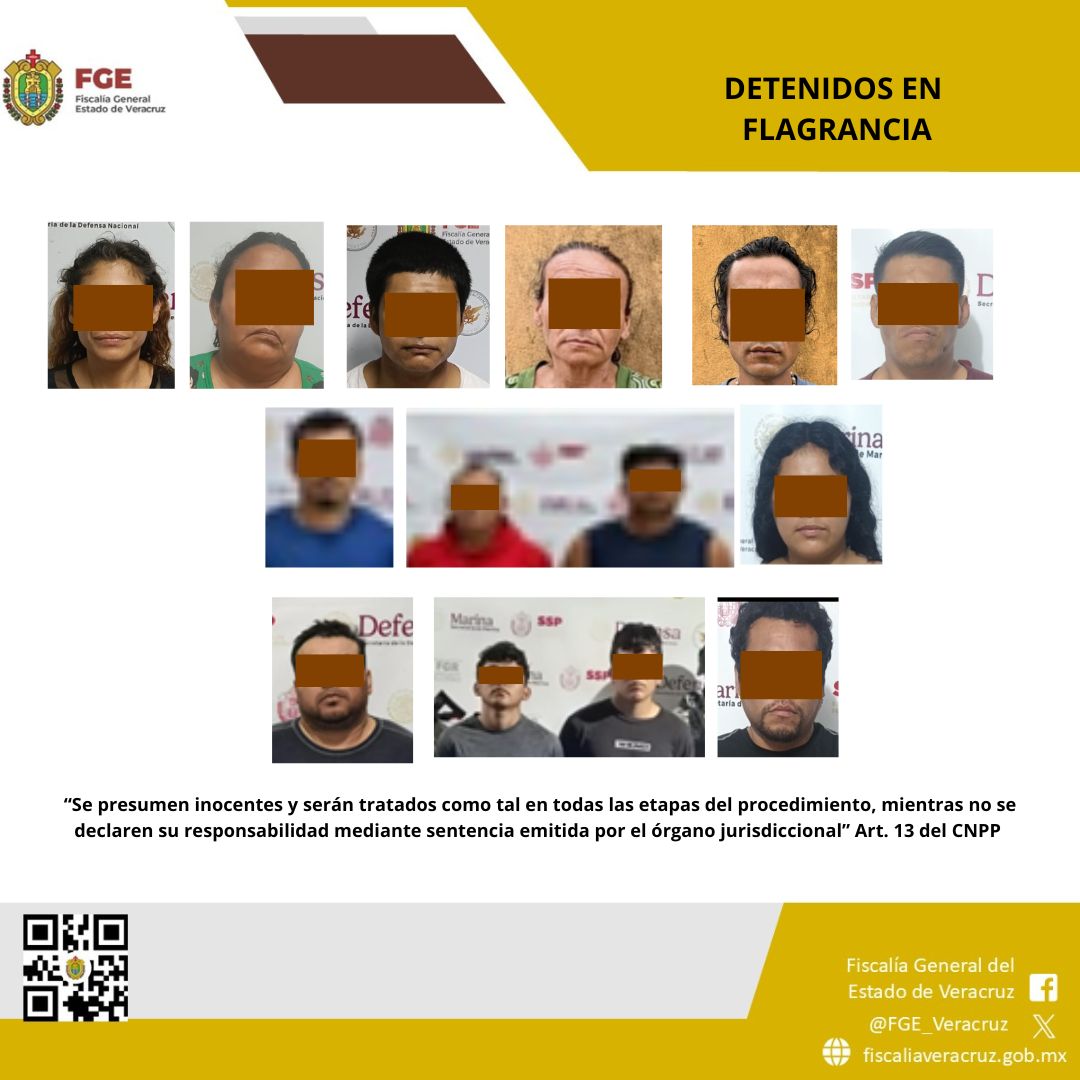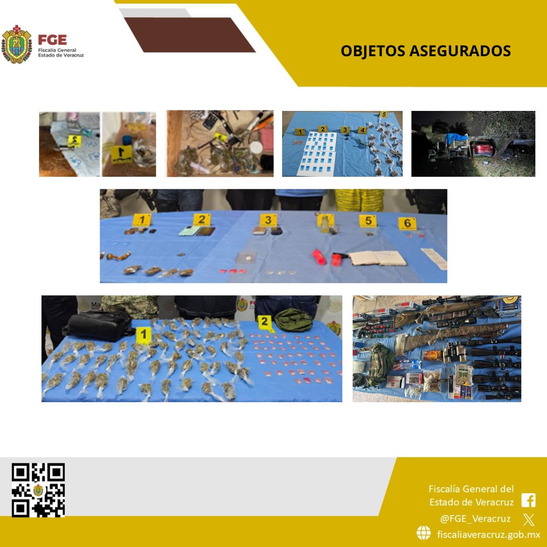 Durante este periodo se realizaron 39 operativos, que derivaron en la detención en flagrancia de 43 personas, así como en el aseguramiento de sustancias con características propias de narcóticos, armas y diversos objetos presuntamente vinculados con actividades ilícitas.Los cateos se efectuaron en los municipios de Emiliano Zapata, Xalapa, Jalacingo, Misantla, Martínez de la Torre, Coatepec, Boca del Río, Veracruz, Alvarado, Orizaba, Nogales, Tenampa, Minatitlán, Coatzacoalcos, Catemaco, Juan Rodríguez Clara, Chacaltianguis, Isla, Playa Vicente, Tres Valles, Tierra Blanca, Naranjos, Ixhuatlán de Madero, Tempoal, Tuxpan y Papantla.Se aseguraron teléfonos celulares, una laptop, hierba seca color verde con características similares a la marihuana, motocicletas, una motoneta, un paquete de hojas para sábanas, pipas, cartuchos útiles, cargadores abastecidos, armas cortas, una piedra blanca granulada con características similares a la droga conocida como cristal, un arma de fuego y un arma blanca.