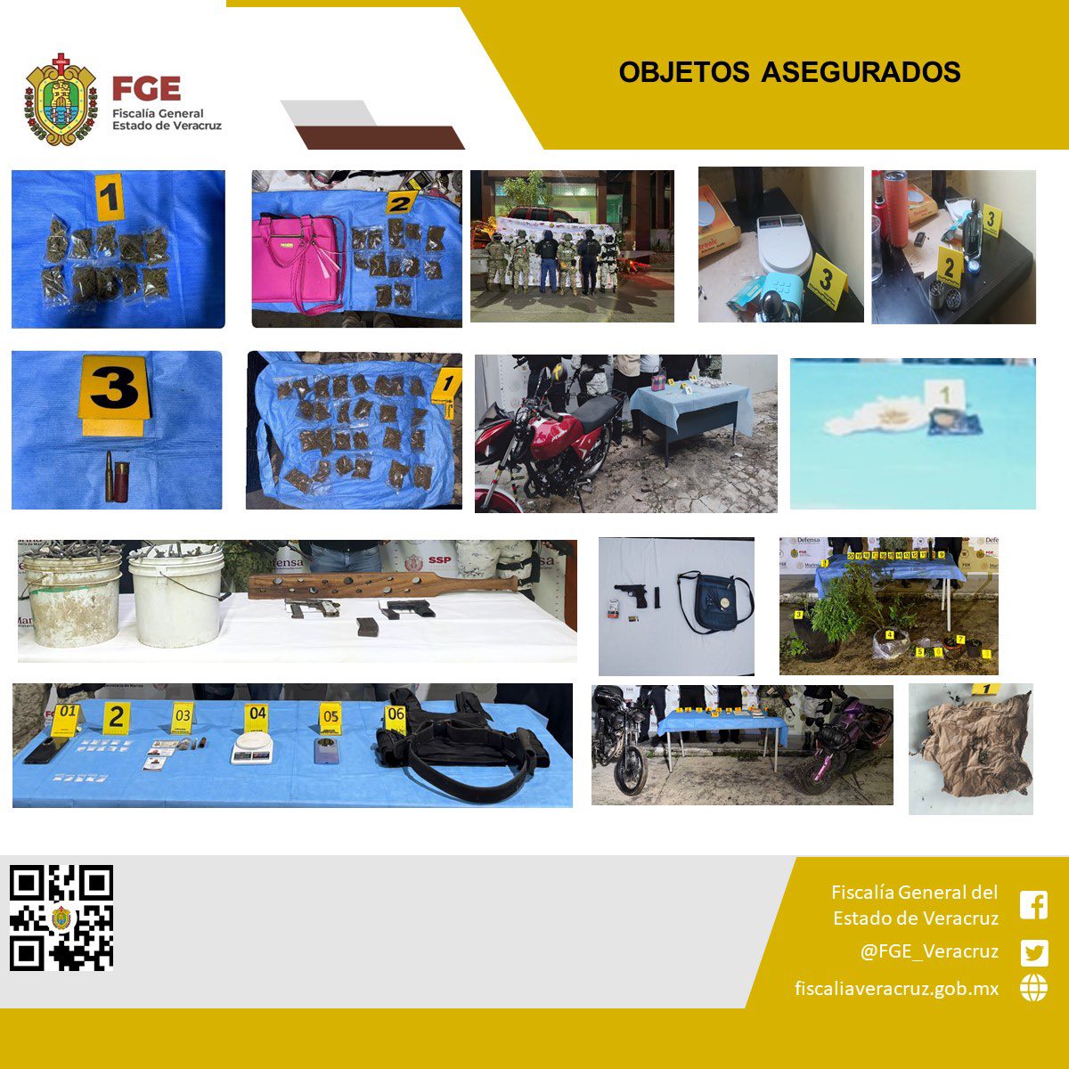 Xalapa, Ver., 29 de diciembre de 2025.- En el marco de la Estrategia Nacional de Seguridad, del 22 al 28 de diciembre del presente año, la Fiscalía General del Estado, a través de las siete Fiscalías Regionales, realizó operativos de cateos en diversas regiones del territorio estatal, en coordinación con la Secretaría de la Defensa Nacional, la Secretaría de Marina, la Guardia Nacional y la Secretaría de Seguridad Pública Estatal.Durante este periodo se realizaron 13 operativos, los cuales derivaron en la detención en flagrancia de 8 personas y el aseguramiento de sustancias con características similares a narcóticos, armas, vehículos y diversos objetos presuntamente vinculados con actividades ilícitas.En los municipios de Veracruz, Tierra Blanca, Fortín de las Flores, Coatzacoalcos, Minatitlán, Cosoleacaque, Las Choapas, Tuxpan, Rafael Lucio, Xalapa y Martínez de la Torre, fueron asegurados hierba verde seca con características similares a la marihuana, una sustancia granulada color blanco y material rocoso cristalino con características similares al cristal, teléfonos celulares, básculas grameras, un chaleco táctico, fornituras, casquillos y cartuchos balísticos, identificaciones, vehículos, motocicletas, pipas y otros artefactos para el probable consumo de enervantes, además armas de fuego, cargadores balísticos, objetos metálicos tipo ponchallantas, una tabla de castigo, llaves vehiculares, macetas con plantas con características similares a la marihuana, una culata retráctil y una libreta con anotaciones.En seguimiento a estas acciones, las personas detenidas fueron puestas a disposición del fiscal correspondiente, quien, dentro del término constitucional establecido, definió su situación jurídica.La Fiscal General del Estado reafirma su compromiso de continuar fortaleciendo las acciones coordinadas en materia de seguridad en todo el territorio estatal con el objetivo de contribuir a la preservación del orden y la paz social en Veracruz.